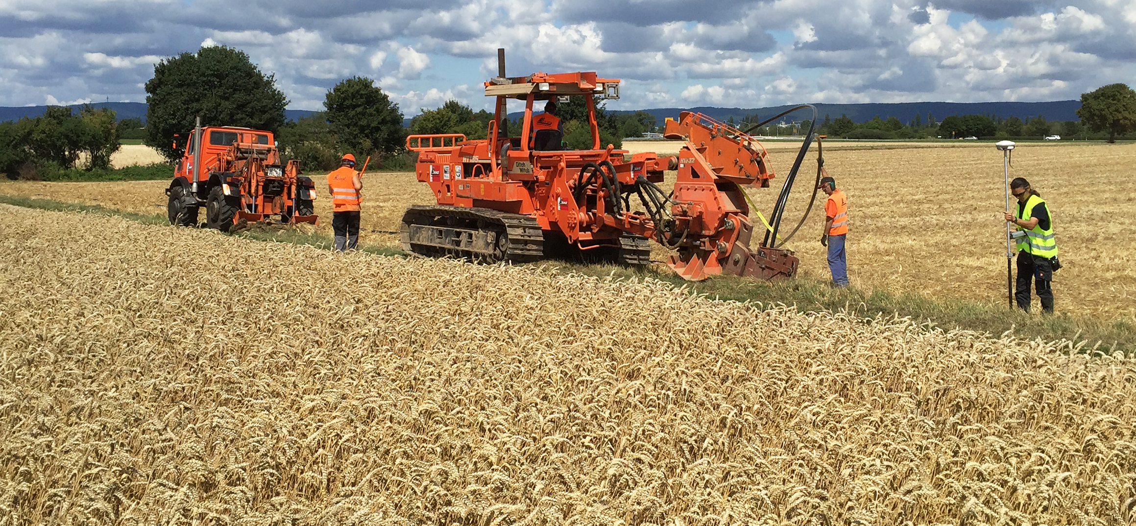 Kabelpflügen stellt ein wirtschaftliches und umweltschonendes Verfahren dar, das große Tagesleistungen ermöglicht. Hinter uns bleibt nichts als eine schmale Spur im Gras.